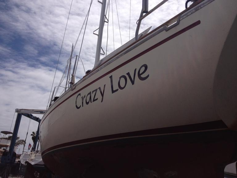 Today John Hurst of Shelter Island Sign Shop put a name and home port on Crazy Love. The best illustration is a few photos: