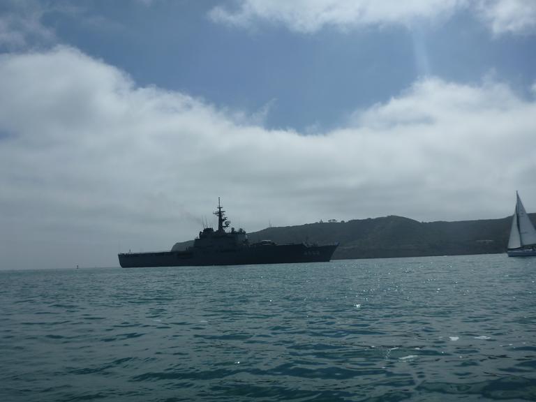 We pulled out of our slip at 1:20pm and arrived in Mission Bay at about 8:30pm. The trip was uneventful - that's a good thing - except for passing this Japanese Navy ship as we exited San Diego Bay.