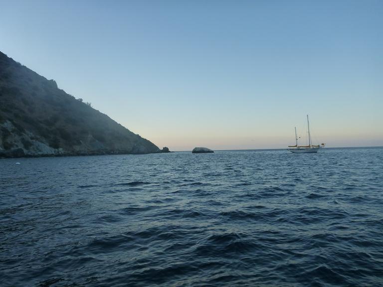 On Wednesday morning we decided to head for an anchorage between Avalon and Long Point. While leaving the mooring, I put the engine in gear before the mooring line had completely sunk to the bottom and the line wrapped around the prop and caused the engine to stall. Ugh! Fortunately, we have experience dealing with situations just like this. Unfortunately, It was a cold, overcast morning and I got to go for a swim. It took about 15 minutes to unwrap the line from the prop and we were finally on our way out of Avalon. Lesson learned.