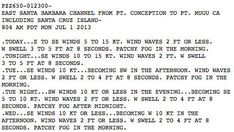 For today's trip to Santa Barbara, we have an odd looking forecast. An odd looking, but very positive forecast. If the winds actually blow from the East, they will be almost directly behind us. That'll make for some nice sailing.