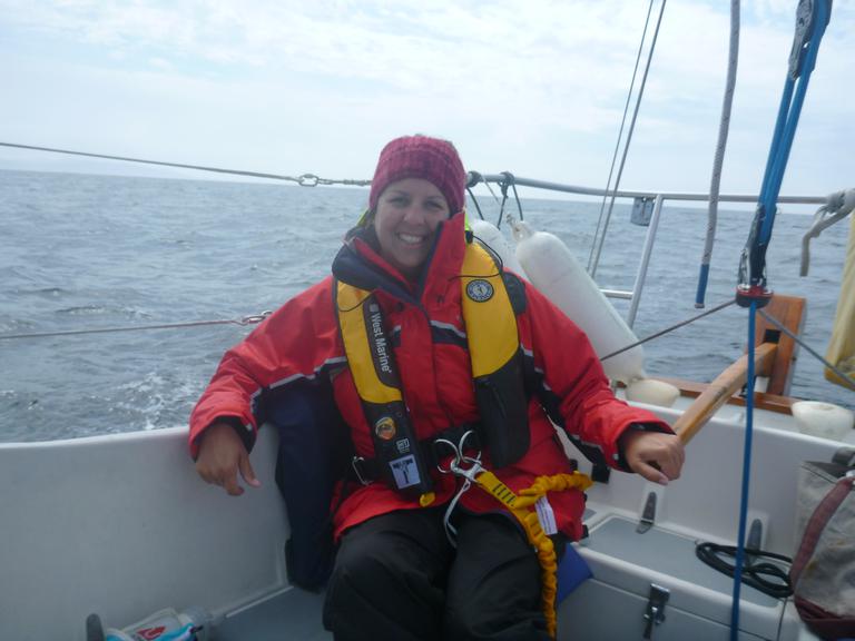 Both Carolyn and I had a lot of clothes on. I was wearing a long sleeve t-shirt, vest, sweatshirt, foul weather jacket on top and long underwear, pants, foul weather pants, and rubber boots on the bottom - I picked up the boots in Santa Barbara and I'm very glad I did. I also had a scarf (Thank you Carol!) and beanie for my head. Carolyn had a similar ensemble. It protected us well from the wind and water, but it made going to the bathroom quite a chore. Imagine this...you're wearing all the clothing you own and you have to go pee but your toilet is mounted on a tiny platform that moves six to twenty four inches in any direction at any time. Quite a challenge when you have your knickers around your ankles. And yes, on the boat I sit to pee.