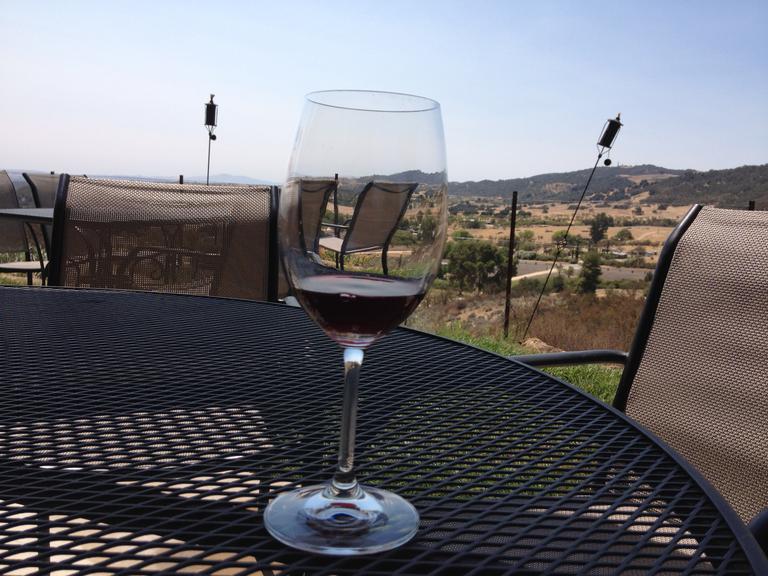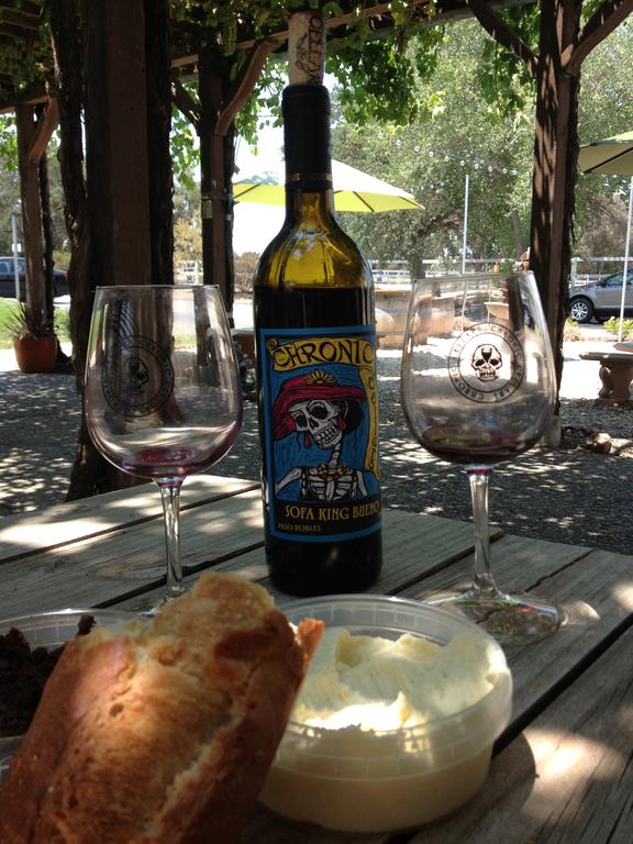 Carolyn booked us an inexpensive rental car (thank you Budget!) and used some Hilton points to book us a room at the Hampton Inn & Suites just off the 101 in Paso. Before checking into the hotel, we hit two wineries - Mondo and Chronic. At Chronic, we sat on their lovely covered patio and enjoyed our Farmer's Market bounty in a welcome 90 degree heat.