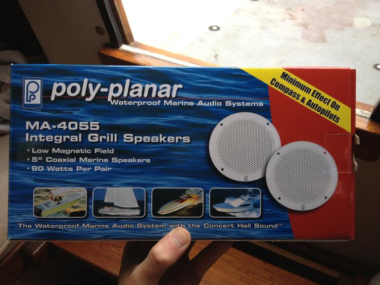We bought speakers of the same make and model as our old ones so they would be a drop in replacement. It took less than 20 minutes to install them and they sound great. Ever since we bought the boat we've only had one working speaker. I replaced the stereo during our May boatwork sprint, but skipped the speakers because I figured we could do without. I was very wrong. The new stereo sounds much, much better with two working speakers. We've been listening to the World Series the last few nights and it sounds great!