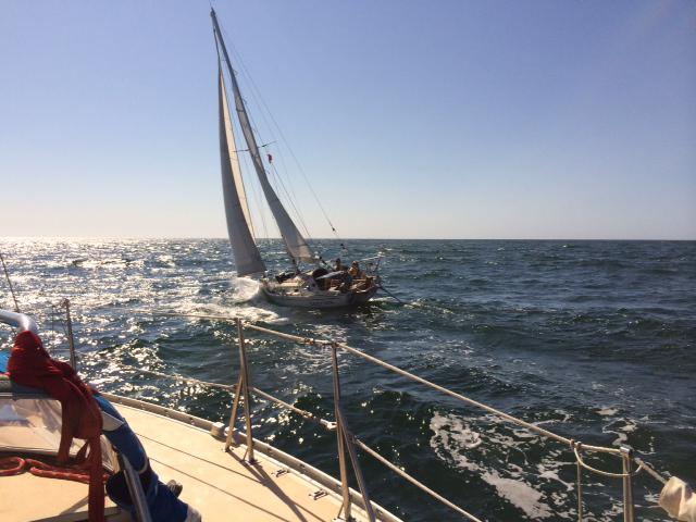 Back under full main with the jib still on the pole - that's >24hrs since we put it out w/o touching it. Moving along well at 4.5-5.5 kts. Little to no rolling.
