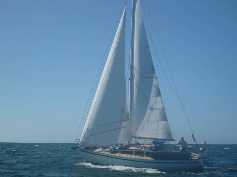 10:30a - Spotted land for the first time. We're moving slowly under full sail with a tiny breeze. Still hoping to anchor in Radio Bay this evening.