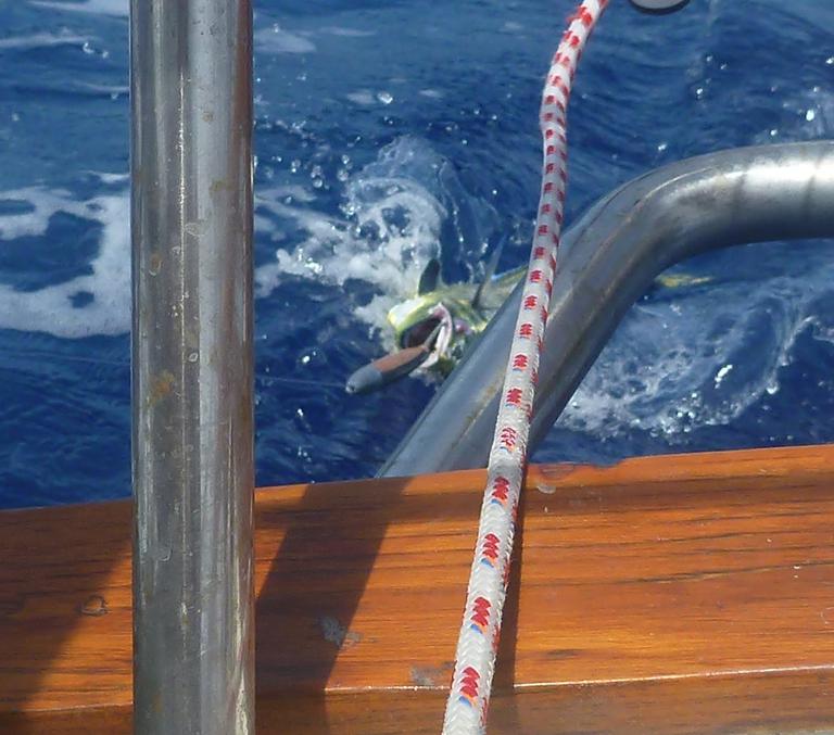Busy, busy day. It started as normal... but with us making a bit to much North we decided a jibe was in order. This meant moving the poled out jib to the other side and switching tacks (not that it matters since we haven't seen another boat in weeks.) Simple enough you would think, but the roller furling, pole, toping lift got hung up and stuck. Dave on the bow with rolly waves and me at the helm trying to keep our course made for an exciting post breakfast mini-adventure and in the midst of it all we hear a sick sounding motor turning on, is that the bilge pump? and it wouldn't turn off. We abandon the pole and jib and try to get the little motor to stop before it burns something up. Dave goes into the cabin to deteremine why. He cut the power going to the battery... yet the sound continued. It finally stopped but well he had cut the wrong wire and had to rewire his mistake. We now have no auto bilge pump. Good thing we can manually pump out. We did get back to that jib and sorted it all out. Also, Dave caught a fish! In time for dinner no less.