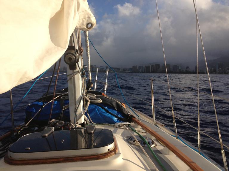 The sail from Manele Bay to Honolulu was a bit frustrating. It should have been dreamy downwind sailing, but the roller furling jammed again, so we couldn't use the jib. Ugh! Without the jib, we can't balance the sails enough to use the windvane. That means hand steering. Double ugh! I don't mind steering by hand, I just don't want to do it in the middle of the night. On the upside, the roller furling didn't completely fail until we were 25 miles outside of Honolulu so the hand steering was only for the last 6 hours of the trip.
