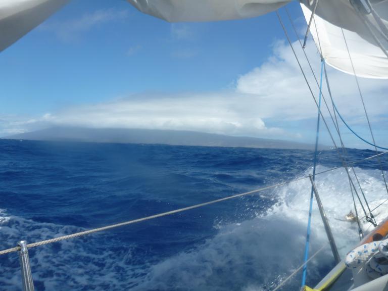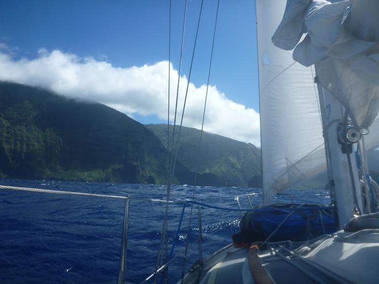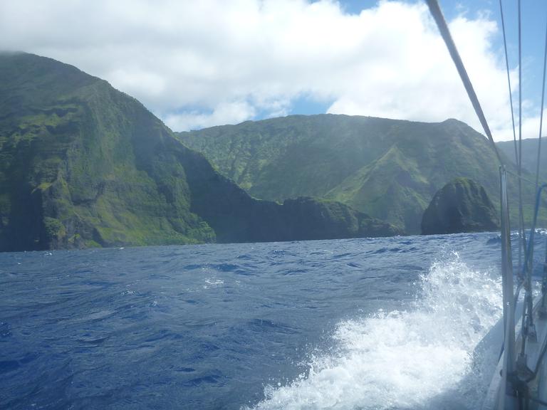 After five days at anchor in Honolua Bay, we headed around the east end of Molokai via the Pailolo Channel. This was a sporty crossing - 15+ kt winds with 5-8ft waves - but nothing like the Alenuihaha Channel. It was easier mostly because we did this crossing first thing in the morning rather than in the middle of the night. The crossing itself was less than 10 miles. When we rounded Cape Halawa we were able to ease the sheets and fall off the wind. Then the beautiful sailing happened.