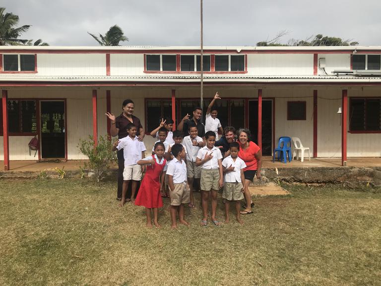 Anchorage 15, Nuapapu, Matamaka - On Tuesday we headed across the way to yet another island, Nuapapu. This anchorage had a few moorings and we grabbed one. We were the only boat. Wednesday we saw more rain and a bit of wind. Being on the mooring here it was a little rolly but not terrible. We were hoping for a break in the weather to row ashore when we were visited by a boat from the island with the principal of the primary school and his kids. The school maintains the moorings and collects fees for support of the school. We were happy to make this donation and had taken a box of art supplies from HI to give to schools along the way. We asked if it would be ok to come ashore with these donations the next morning. The next day we rowed in and followed the path to the Matamaka Primary School. There are only 10 children who attend all ages from first through eighth grade. All boys but one girl. The school has a large common area with shelves of books and two classrooms. One teacher in addition to the principal. They were very welcoming and offered us breakfast of fish cooked in coconut milk with taro. The older boys were studying for the exams to get them into high school. High school means moving into town with auntie and uncle as there are no high schools in the outer islands.